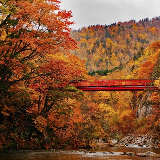 位於定山溪村内的二見橋(距離豐平峽大壩約5分鐘車程),也是喜歡賞楓的朋友不容錯過的地方。沿著溪邊散步,腳下的落葉及眼前的楓葉都相當引人入勝,散步後還可以在這裡選一間溫泉好好享受!