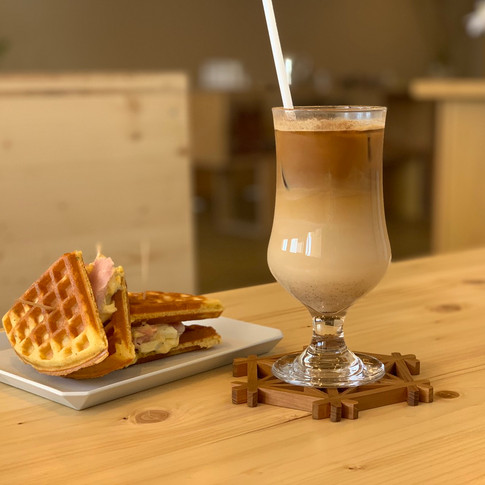 也要和大家推薦這個夏天全新推出的草莓鬆餅,草莓的微酸加上一點點糖漿調和,再搭配一杯Ice Latte就是絕配。從草莓到鮮奶油、優格、鬆餅粉都是北海道產,將北海道的大自然也吃進嘴巴裡面。右圖的火腿蛋鬆餅也是堅持採用北海道在地食材,搭配一杯Chai Latte剛剛好!
